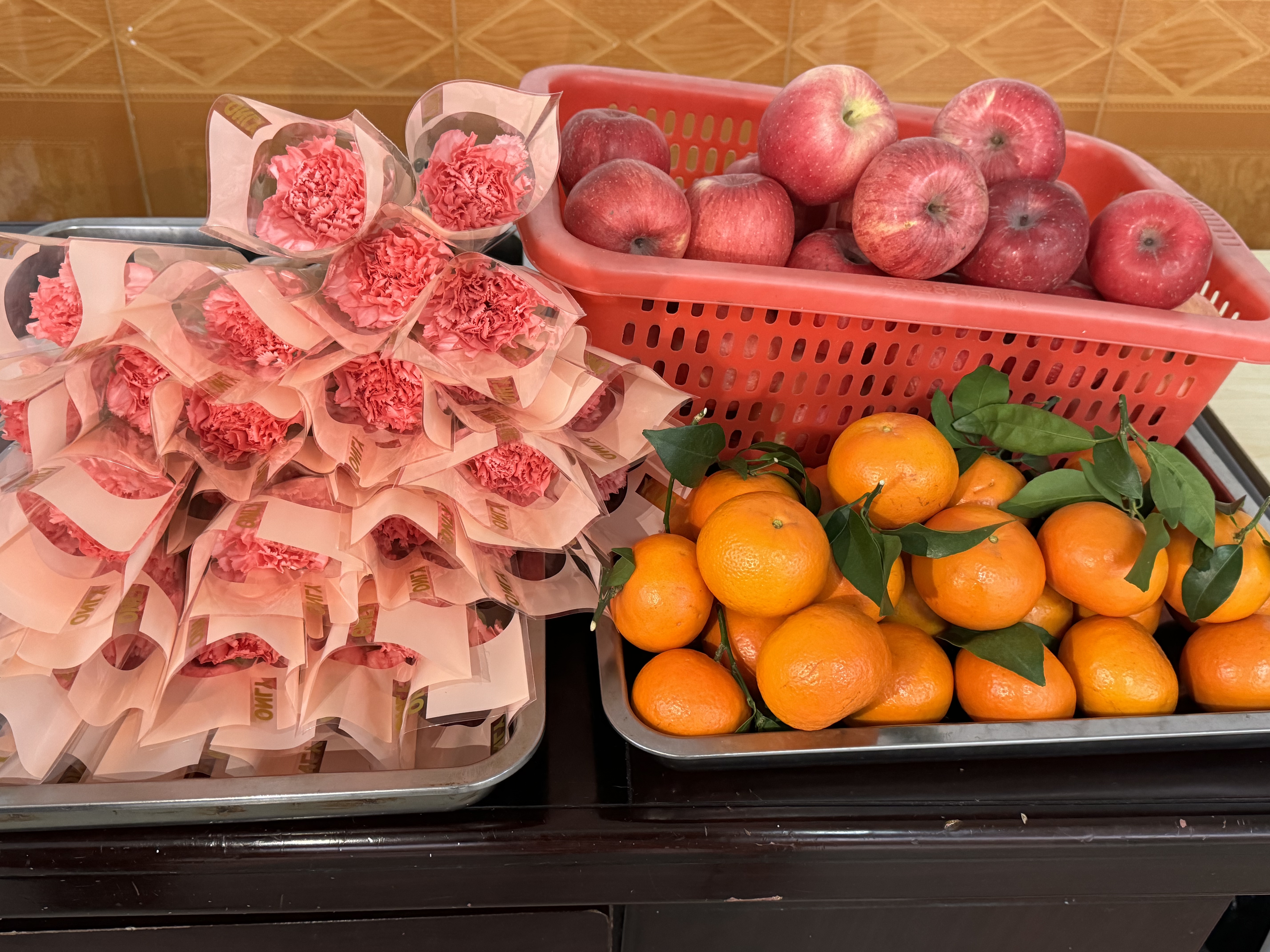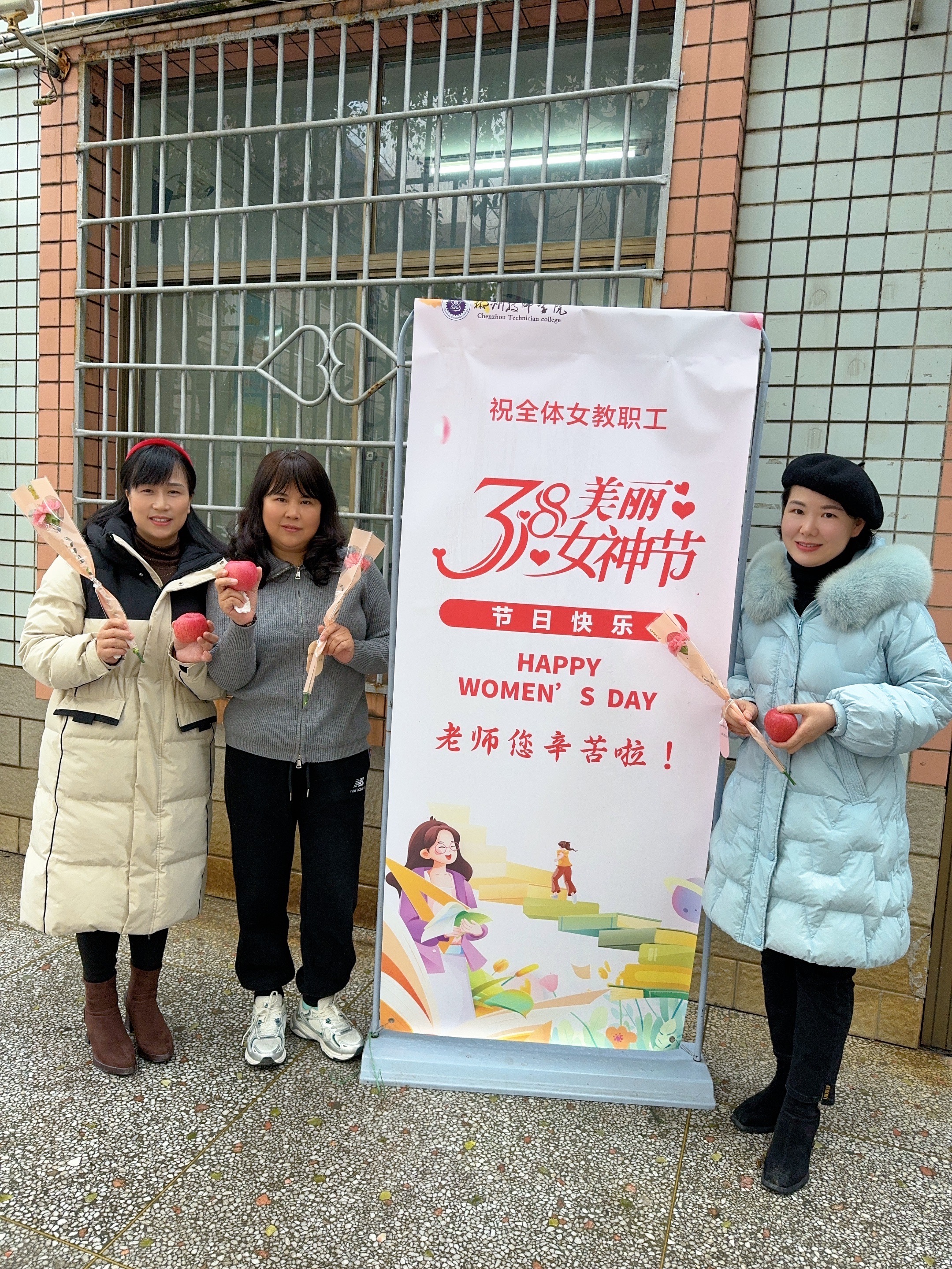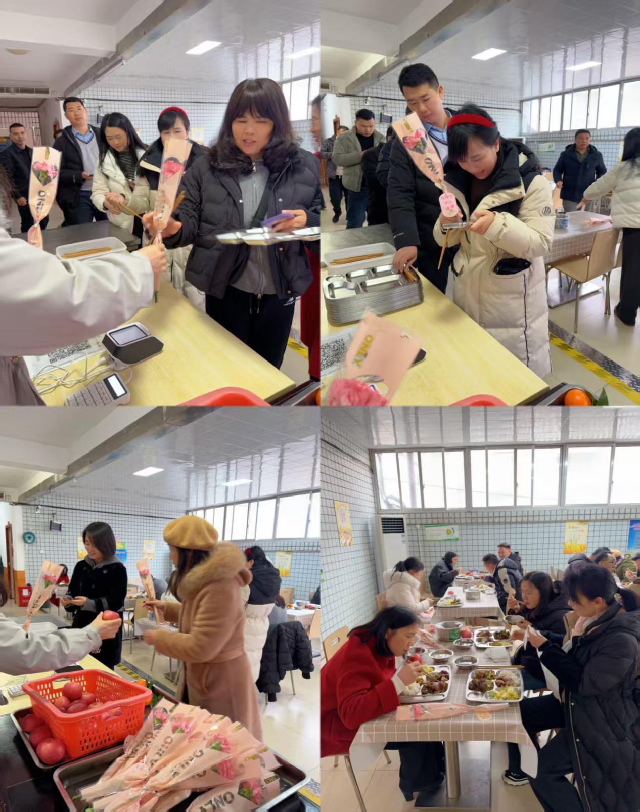 在食堂门口为每位女教职工送上鲜花与贺卡。用一份爱心与温暖致敬校园中的女性力量。